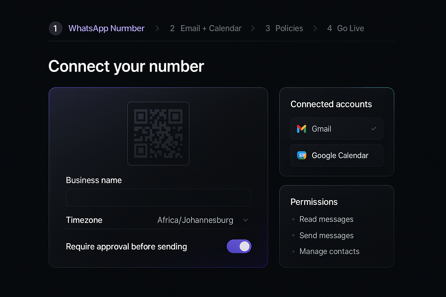 Link your personal WhatsApp number and decide whether the agent needs approval before sending.