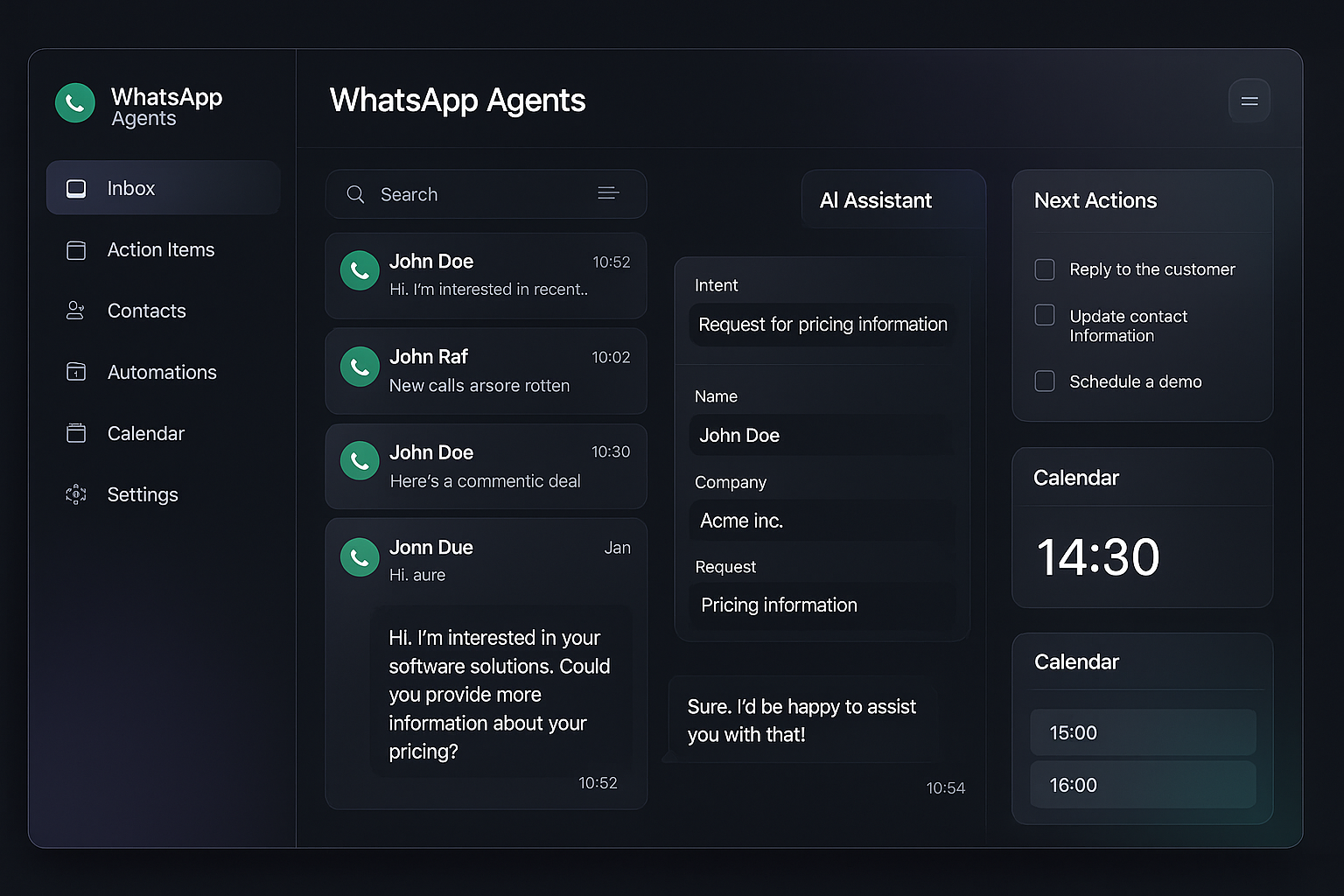 One dashboard for WhatsApp + email + social, with suggested replies, extracted fields, and next actions.
