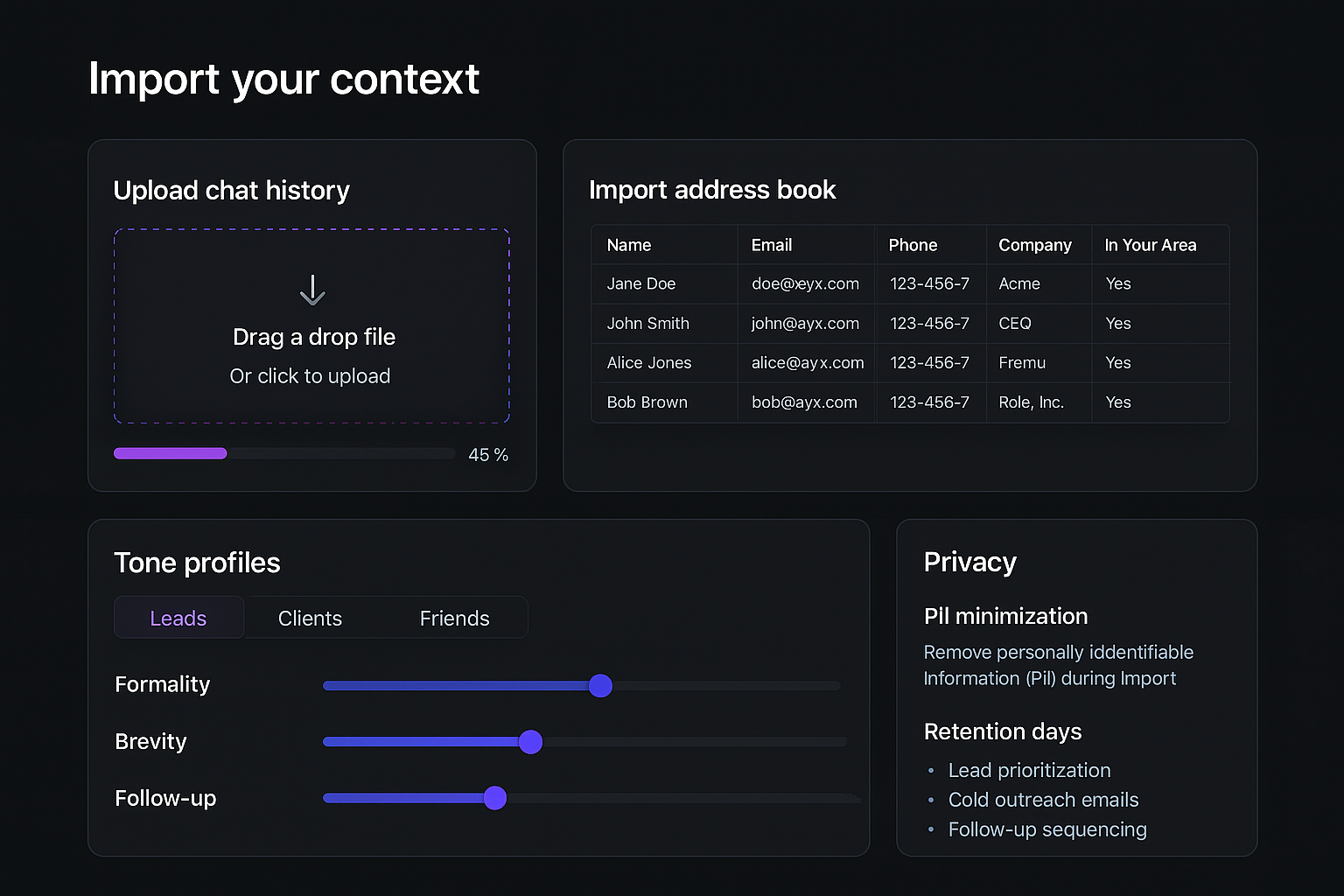 Upload chat history and an address book so the agent understands relationships and writing style.